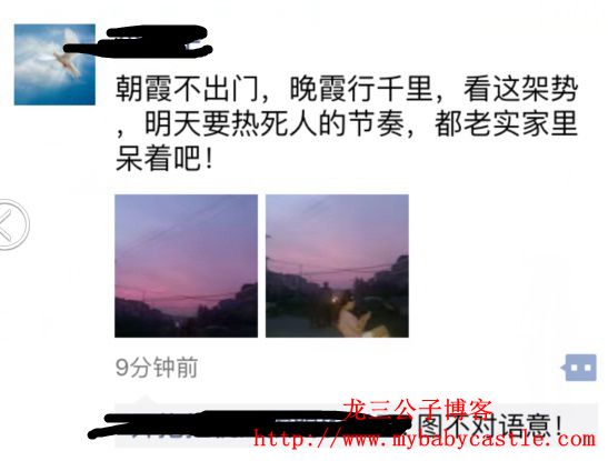 我把其两张图截一张图下来(如上图),看得出来,这确实是霞。霞嘛,是一种自然现象,又叫火烧云。但火烧云的色彩一般是红彤彤的,这个不够红。不过,这些天天气又开始炎热起来,确实明后几天一天比一天温度过高,按照朋友的意思,明天一定炎热是真的。所以我觉得,如果真要用这图配谚语,应该换作朝霞不出门(有雨),晚霞晒死人(大晴天),或者朝起红霞晚落雨,晚起红霞晒死鱼;又或者今天火烧云,明天热死人。诸君以为呢?