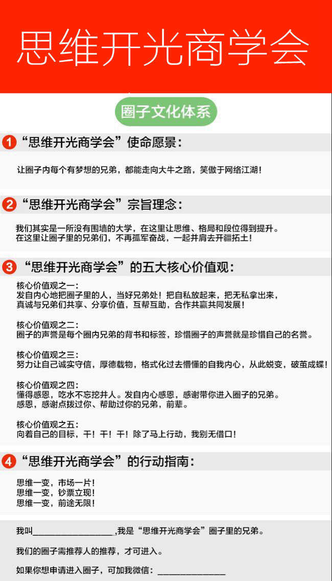 有人私下问我,你加入的到底什么圈子?是作什么的?圈子都有文化的,你们有么?……我二话没说,“嗖”的就传过去一张我们“思维开光商学会”圈子文化体系的图片!问这话的人是个明白人,确实这是非常重要的,最起码是一个筛选的过程。只有看完我们的价值体系认同的,联系你的,才是基本靠谱的。你们说是不是?